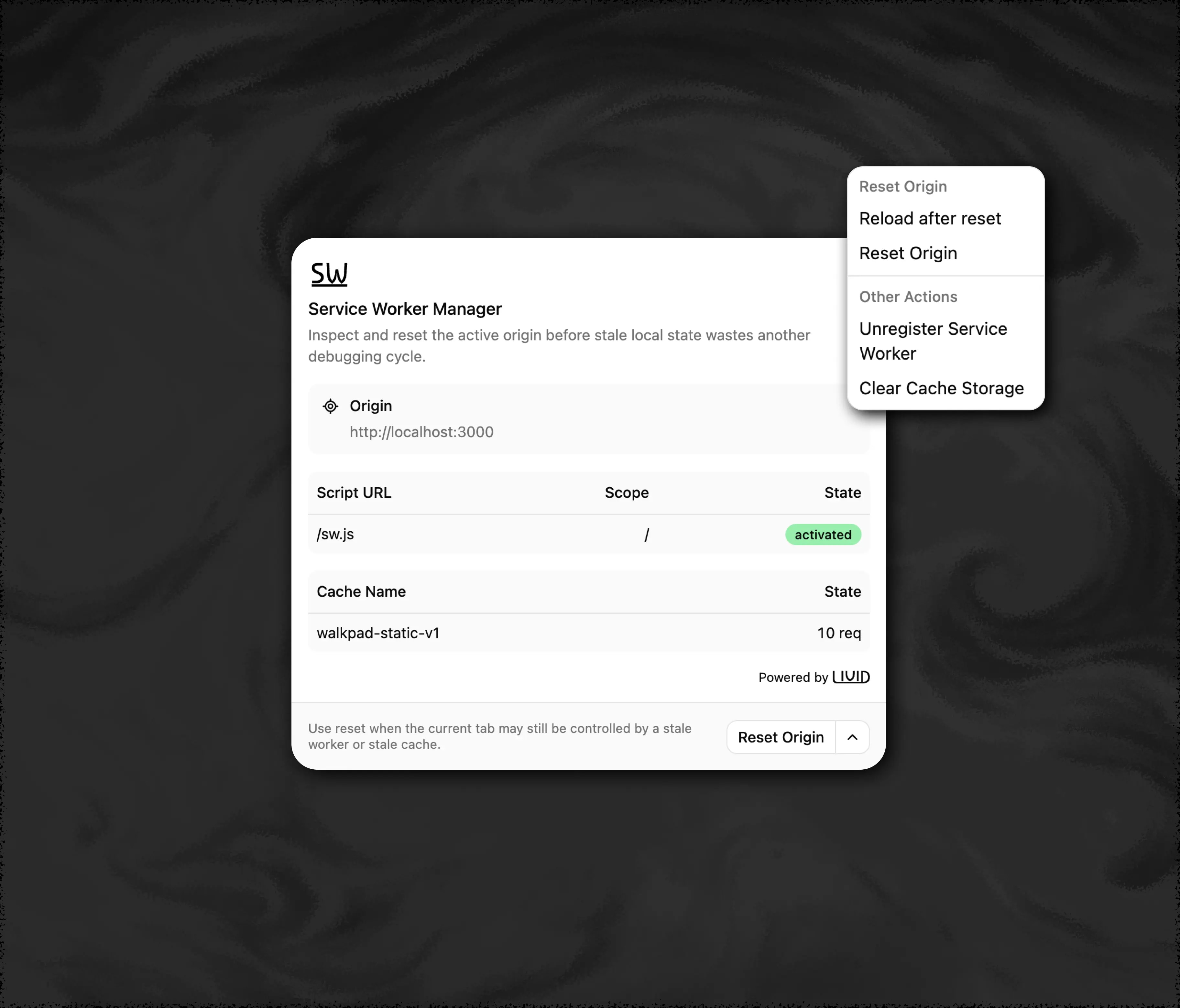 A free-to-use, proprietary Chrome extension we built in-house, then published, to help developers inspect and reset service workers and Cache Storage for the current origin.